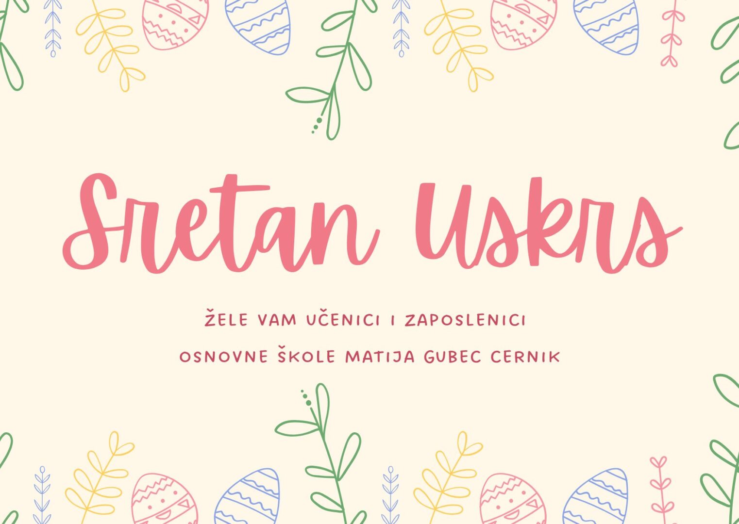 Sretan i blagoslovljen Uskrs žele vam učenici i zaposlenici Osnovne škole Matija Gubec Cernik.